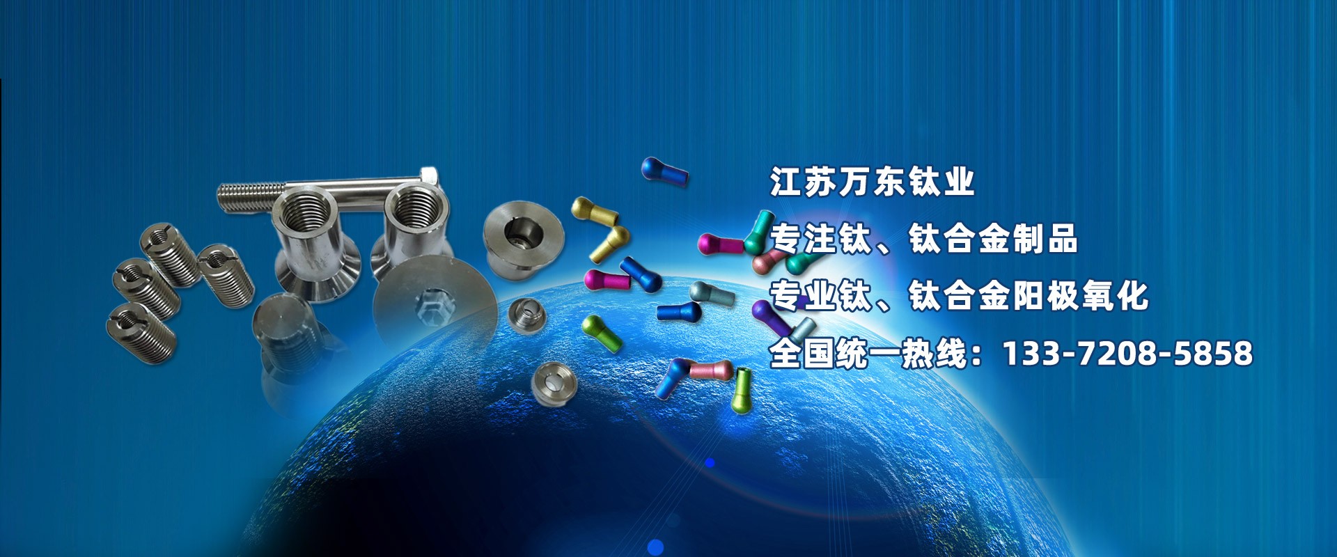江蘇萬東鈦業科技有限公司坐落于中國江蘇省南通市,擁有28年的鈦合金研發技術,公司專業從事:鈦陽極氧化、鈦合金陽極氧化、脈沖氧化。鈦合金緊固件生產:M0.6以上高品質:螺絲、螺母、螺柱、螺套、可根據用戶的特殊要求定制。